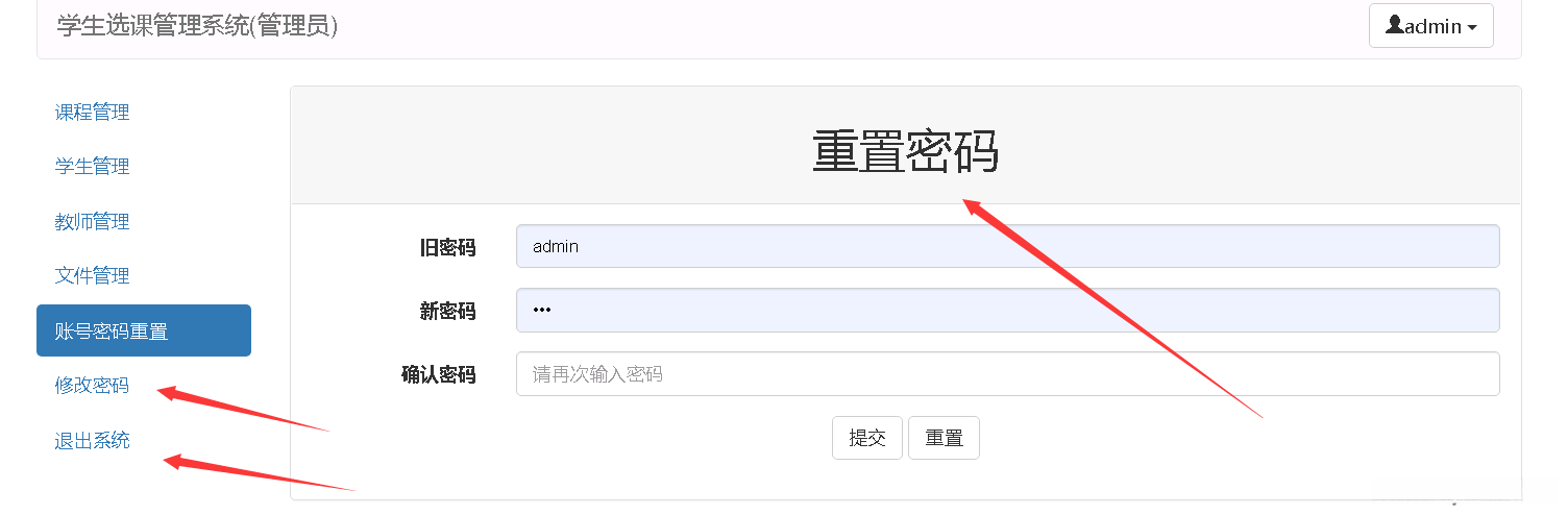 管理员能够进行教师信息、学生信息以及课程信息的增删改查操作。相应的用户账号具备重置其他用户账号密码的能力。