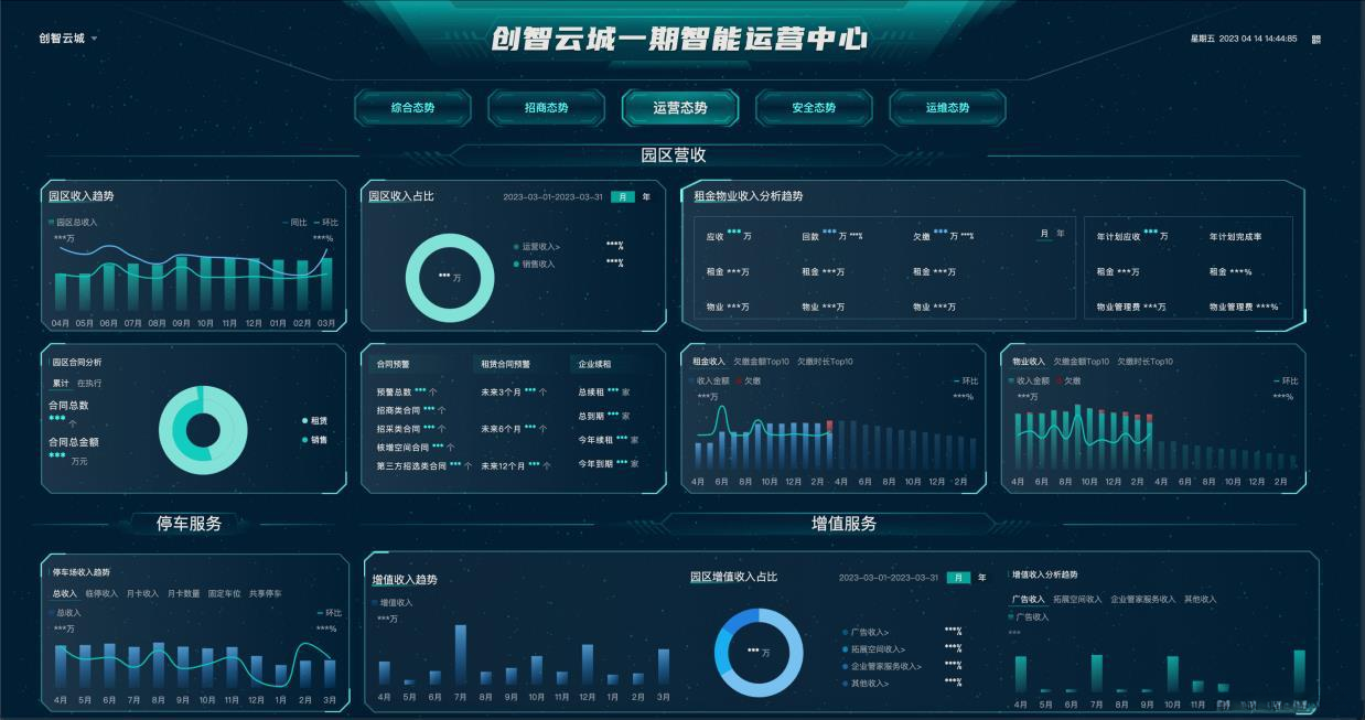 创智云城项目建设多园区IOC数据可视化分析平台,以数据推动经营决策科学化。IOC数据可视化分析平台是园区多维态势的综合展示及数据分析平台。平台整合园区各系统的数据资源,覆盖园区招商运营、运维、安全各业务板块,实现园区态势监测,及经营指标分析。通过IOC数据可视化分析平台,可以从园区综合态势、招商态势、运营态势、安全态势、运维态势各个维度展示、分析园区,实现创智云城园区全景画像。