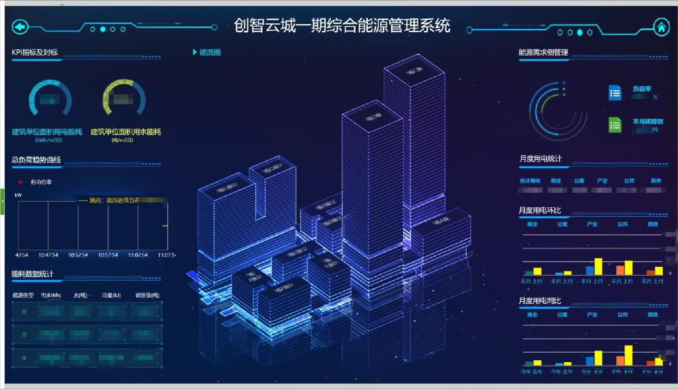 能耗精准计量与统计分析、机电设备智能控制是园区绿色节能的必经之路,创智云城项目在建设阶段就充分考虑园区运营节能降耗的需求,在用水、用电公共回路、用户回路上共计安装近万块智能电表、智能水表,在此基础上建设综合能效管理平台,支持水电等分类能耗的计量采集和能耗分项计量统计,实现能耗数据结构化统计和对比分析,同时提供能耗数据查询、统计分析以及能耗指标统计等实用功能,另外还根据园区需求,提供分类能耗的计量计费,能源成本统计管理,重要能耗设备的监管分析等功能。