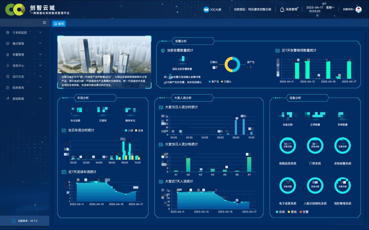 基础设施层面,同类园区中,创智云城较早地建成园区自有数据中心,采用微模块化数据中心建设模式。基础平台层面,应用云计算技术,创智云城建有园区私有云,智慧园区各数字化应用均部署于园区私有云平台;应用物联网技术,园区建设物联集成平台、基础设施运维管理平台,实现对智能化系统、物联网设备、传感器等终端设备的物联集成、各种资源的实时监测、数据采集和信息传递。应用平台层面,应用可视化技术、大数据等技术,建设多园区IOC数据可视化分析平台,将抽象的数据和信息转化为易于理解和分析的可视化形式,并通过打通、汇集园区中各类数据,如业务经营、安防、设备等方面的数据,利用大数据分析技术进行实时分析处理,实现跨系统数据汇聚,为全方位管理决策提供高效的数据支撑。