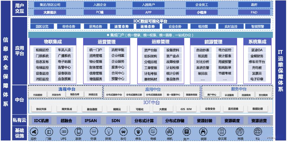 应用平台层主要覆盖园区运营管理、运维管理、物联集成、能源管理、系统集成各板块的丰富智慧应用及服务,以及上层应用IOC数据可视化分析平台。