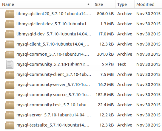 sudo dpkg -i mysql-common_5.7.10-1ubuntu14.04_amd64.deb libmysqlclient20_5.7.10-1ubuntu14.04_amd64.deb libmysqlclient-dev_5.7.10-1ubuntu14.04_amd64.deb libmysqld-dev_5.7.10-1ubuntu14.04_amd64.deb mysql-client_5.7.10-1ubuntu14.04_amd64.deb mysql-community-server_5.7.10-1ubuntu14.04_amd64.deb