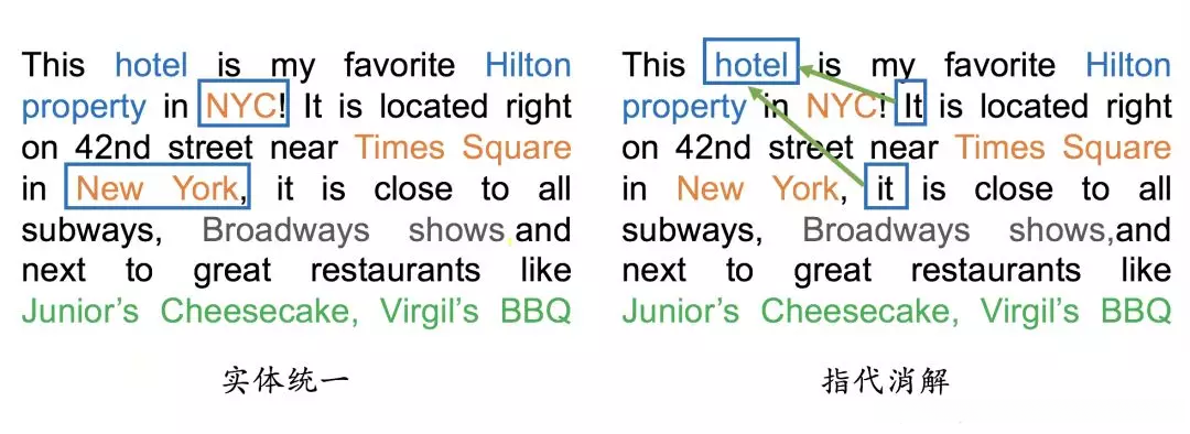 在进行实体命名识别和关系抽取任务时,会遇到两个主要挑战:其一是实现实体统一(Entity Unification),即解决不同表征方式指向同一实体的问题。例如,“NYC”与替代表示法如“New York”表面上不同但指向同一个城市,在这种情况下需要通过某种机制将其归一化处理;其二是指代消解(Coreference Resolution),即确定文本中代词如“it”, “he”, “she”等所指代的具体实体。例如,在本文中被标记出来的两个“it”都指向同一个酒店实体。“实现 entities unification 以及 coreference resolution 相对于前面的问题更具挑战性。”