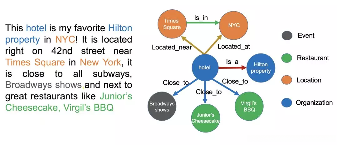 实体识别技术 即从文本中提取并分类/标注实体信息。具体而言,在上述案例中我们能够识别出实体-「NYC」并将其归类为「地理地点」类别;同时也能识别出「Virgil's BBQ」并将其归类为「餐馆」类型。此外我们还可以通过该技术识别出其他复杂的关系网络例如通过分析发现「酒店」与「海顿大饭店」的位置关系是「位于附近」;而「酒店」与「时代广场」的空间关联则是「临近」等信息。这些技术在实际应用中具有重要价值