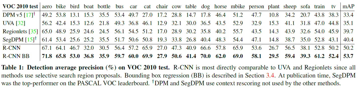 SegDPM(通过整合DPM检测器与语义分割系统输出的方法,在分类时引入了额外的inter-detector context以及image-classifier rescoring);最相关的对比是与UVA系统进行对比,因为我们采用了相同的区域建议算法,在分类过程中构建了一个四层的空间金字塔模型,并采用密集采样SIFT、Extended OpponentSIFT和RGB-SIFT特征进行描述符填充,在量化过程中每个特征都采用了4000字码本策略;随后通过直方图intersection核的支持向量机完成了分类任务。