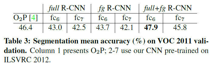 基于VOC2011的数据集测试结果表明,在表3中展示了我们在VOC2011验证集上与O2P方法的对比结果。对于所有采用的特征提取策略,在fc6层的表示总能优于fc7层的表现,在下面的所有讨论中都将关注于fc6层所提取的特征特性。其中fg方法的表现略高于full方法,在一定程度上表明掩盖区域形状所携带的信息更为丰富有力,并与我们的预期结论相吻合。然而,在full+fg组合的整体评估中发现其平均准确率达到47.9%,这一结果进一步证实了仅依赖full特征所带来的重要性