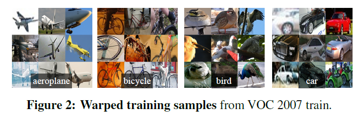 **Feature extraction。**我们使用AlexNet部署在Caffe上,**对每个候选区域提取一个4096维的特征向量。**AlexNet输入为227 * 227RGB,经过五层卷积层和两层FC层计算得到特征向量。因为AlexNet的输入尺寸是固定的,我们首先需要将候选区域进行转换。我们直接使用最简单的方法,不管区域的尺寸以及长宽比,直接将区域所有像素resize到227 * 227。在变形之前,我们对区域进行膨胀,p=16,使得原始网络周围有16个像素包围。图2展示了一些变形之后的区域图像。