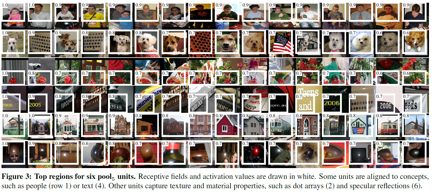 我们对网络第pool5层的units进行了可视化研究。这是网络最后 undergone max pooling后的输出结果。其特征图尺寸计算为6×6×256=9216维,在忽略边界效应的情况下,默认每个unit对应着原始图像(大小为227\times 227)中的一个194\times 194的感受野区域。在第pool5层中观察到的是几乎拥有全局视野的角度;而稍微偏离中心位置的一些unit则会呈现出较小视野范围。