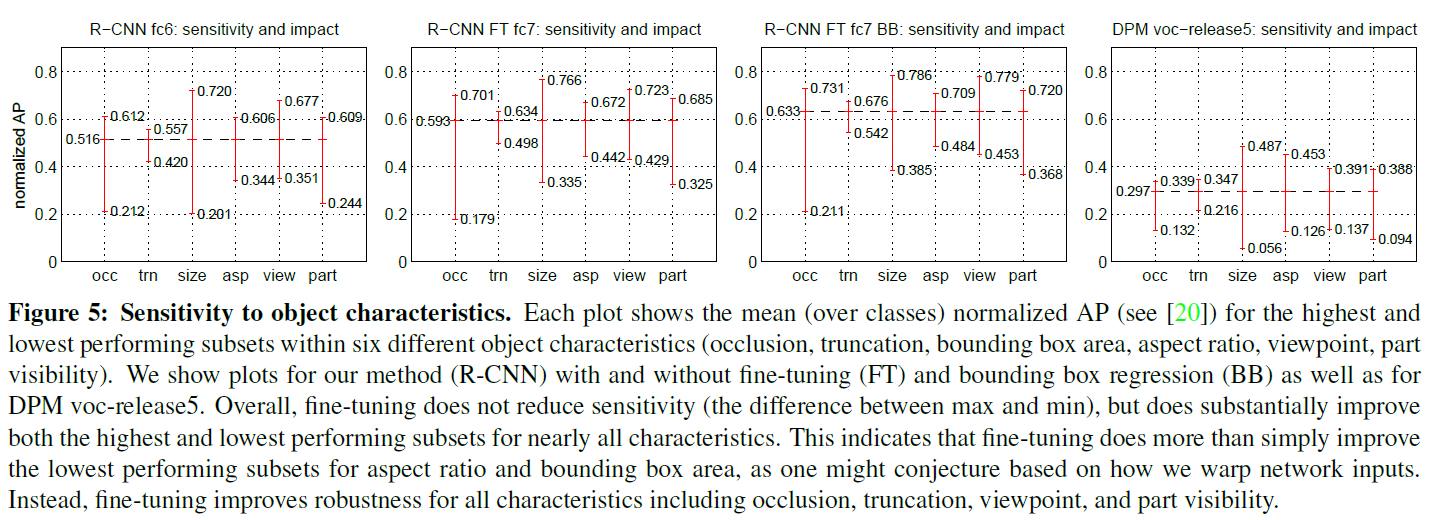 采用先进的监测与分析工具(Hoiem),旨在识别该方法中出现的错误模式,并了解通过微调这些模式的方法;此外还将其结果与DPM所犯错的情况进行比较,请参考图4和图5中的相关内容。