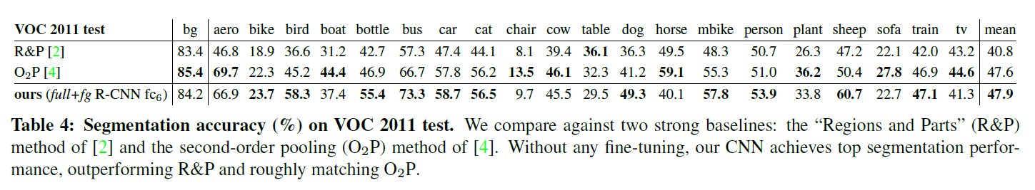 对于语义分割而言,在划分图像区域方面已经形成了一种成熟的技术。为此我们将R-CNN直接应用于PASCAL VOC分割问题上。为了与目前最先进的系统(O2P:second-order pooling)进行全面评估我们采用了其开源框架来进行实验工作。该方法的优势在于能够通过CPMC生成区域的质量以及通过second-order pooling综合多种特征(如SIFT和LBP)来实现最佳性能。