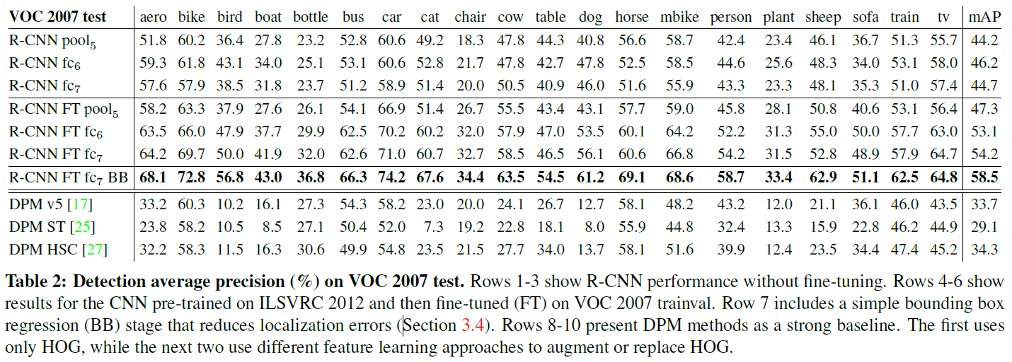 我们的R-CNN的各种形式的表现都超越了这三种DPM方法(上面两个+标准)。