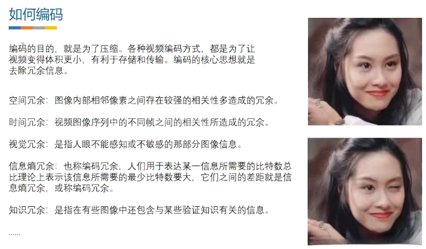 压缩的依据就是,一段连续时间内的视频,相邻的图片之间差别不是很大,而且同一张图片中,还有很多颜色相同的色块,只要把这些冗余去掉、将差别以某种方式传送到播放端,播放端进行解码(其实就是差别+与之前之后相同的部分合并起来),就能播放出完整的视频了。
