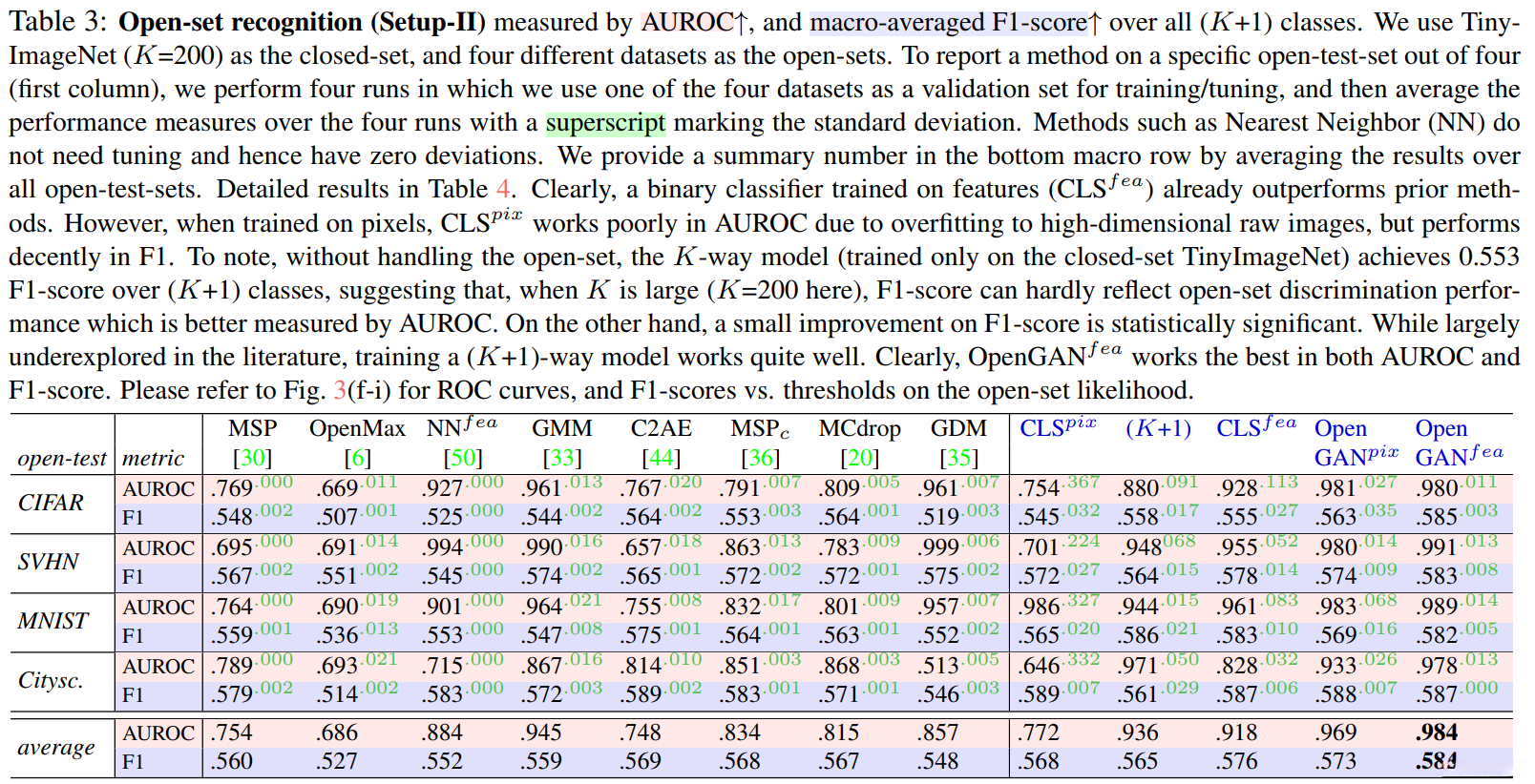 (2) 采用假数据(由生成器合成)与真实开放训练实例(参考离群点暴露[31])共同训练判别器。(3) 我们主要在OTS特征而非RGB像素上进行GANs的训练。研究表明,在图像分类和像素分割等多任务中,OpenGAN显著优于先前的开集识别工作。此外,在基于GAN的方法中,通过将我们的技术见解应用于OTS特征上的方法,并利用验证集选择其判别函数作为开集检测的标准时,能够显著提升基类方法的准确性。