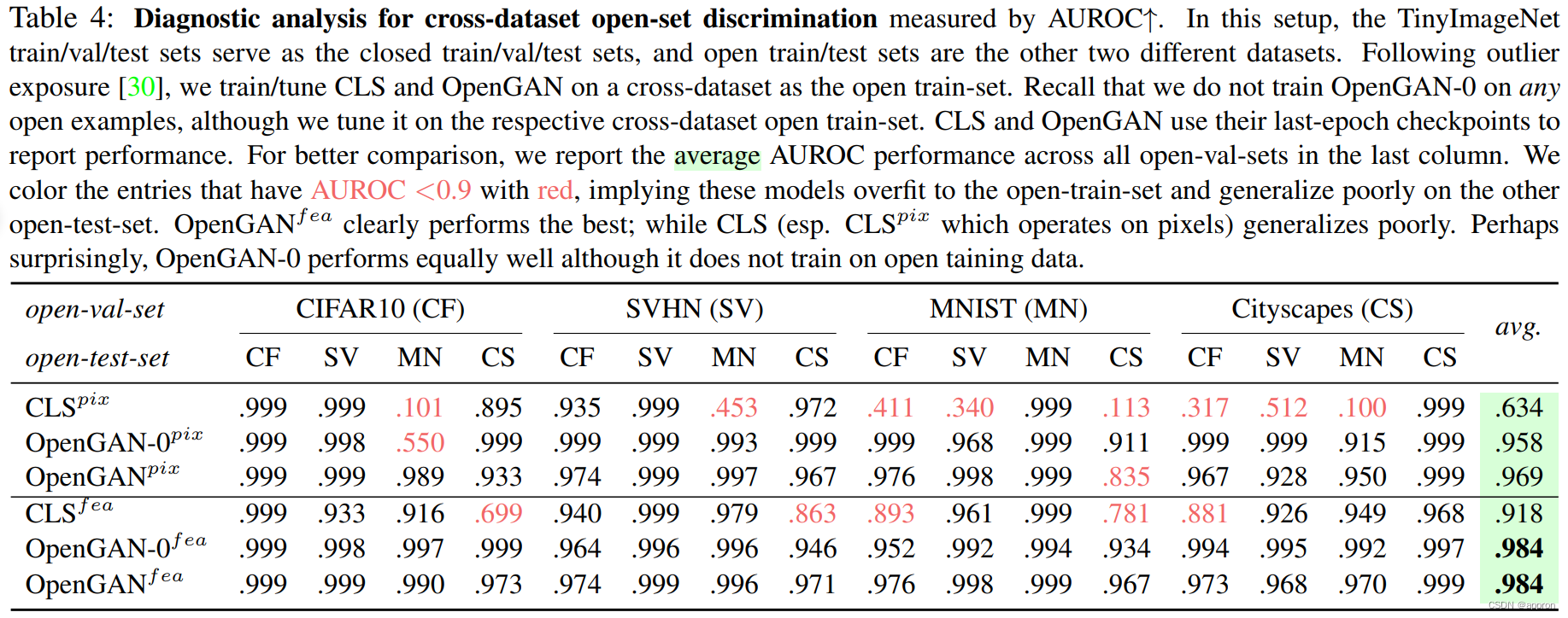 分类与重构分析表明,在现有的研究中,基于GAN的方法主要依赖于重建误差来进行开放集识别[56, 53, 48, 66, 44]。其核心依据是封闭集数据产生的重建误差通常低于开放集数据的特性。尽管这一假设在一定程度上具有合理性[2,9],但如图2所示的Cityscapes图像等复杂高分辨率场景的重建仍是极具挑战性的任务。相反,在这种情况下直接采用判别器输出作为开放集的概率估计会表现出较差的效果[56, 53, 48, 66]。然而值得注意的是,在现有文献中这一方法被认为是效果欠佳的基准模型[37]。然而我们发现,在多个基准测试中该方法的表现首次超越了现有技术水平,并且这种超越得益于第3.1节提出的基于开放验证的选择策略