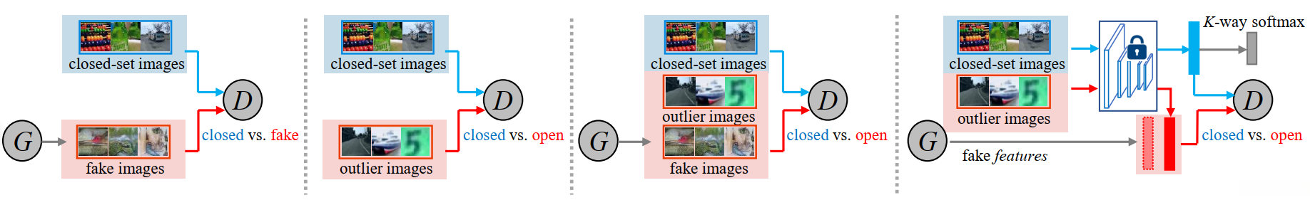 由于经过充分训练的生成器G能够生成逼真的封闭类图像,在这种情况下会导致判别器D无法有效识别开放类数据。我们发现,在这一前提下,以下两种技术表现尤为出色。