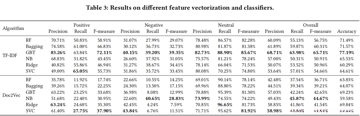 对表3中的不同特征矢量化方法以及分类器的表现进行了评估。考虑到训练数据量相对有限,在包含3000条数据的数据集上进行训练后发现, TF-IDF方法较之Doc2vec略具优势。从分类器性能对比的角度来看, 可能是由于Boosting方法在集成学习过程中将多个弱学习器结合在一起, 同时特别关注那些容易被错误分类的数据点, 最终由此得出结论: Gradient Boosted Trees(GBT)表现出最佳的整体效果。