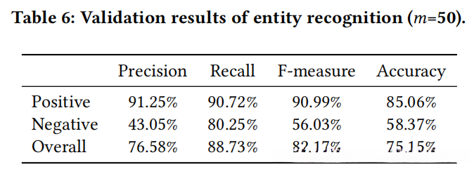 在实验训练过程中所得出的最优m值是50。综合考虑下的各项指标包括准确率、召回率以及F-1分数均达到75%。值得注意的是,在处理负面评论时,SentiSW的实体检测准确率相对较低,并推测可能存在的疏漏或未被涵盖的规则。性能评估如下: