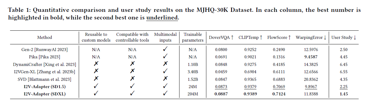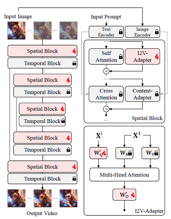 I2V-adapter中采用零初值,并仅对输出映射矩阵及q映射矩阵进行训练。为了进一步提升模型的理解能力,增加了内容适配器(即IP-adapters)。