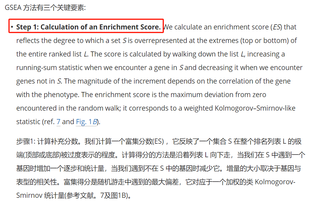 评估基因集的富集程度(Enrichment Score, ES)。Enrichment Score (ES)衡量基因集成员s在排序列表L中两端富集的程度。从排序列表L的第一个基因开始分析,在此过程中对属于集合s的基因进行累计统计,在遇到不属于集合s的个体时则进行相应调整。具体而言,在每个步骤上如果遇到属于集合s的个体,则增加累积统计值;反之,则减少累积统计值。这种调整幅度与该个体与研究表型的相关性直接相关。最终确定的最大峰值值即为我们所求的Enrichment Score (ES)。