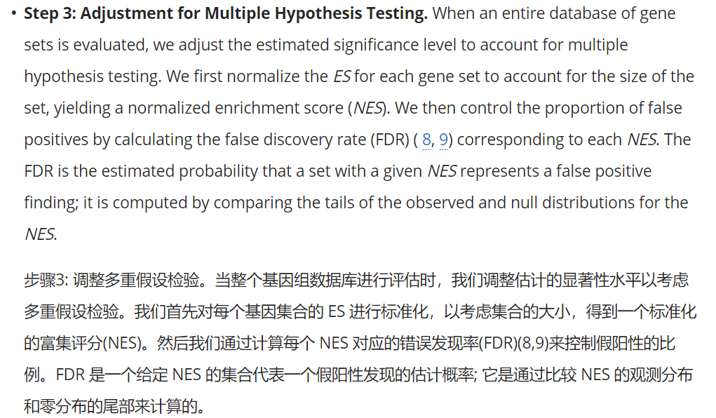 - 多重假设检验矫正过程如下:首先对每个基因子集s计算其标准化效应量ES,并将其按基因集大小进行调整以获得标准化效应量Normalized Enrichment Score (NES);随后基于 NES 计算假阳性率;此外还有一种不同的方法用于计算 NES