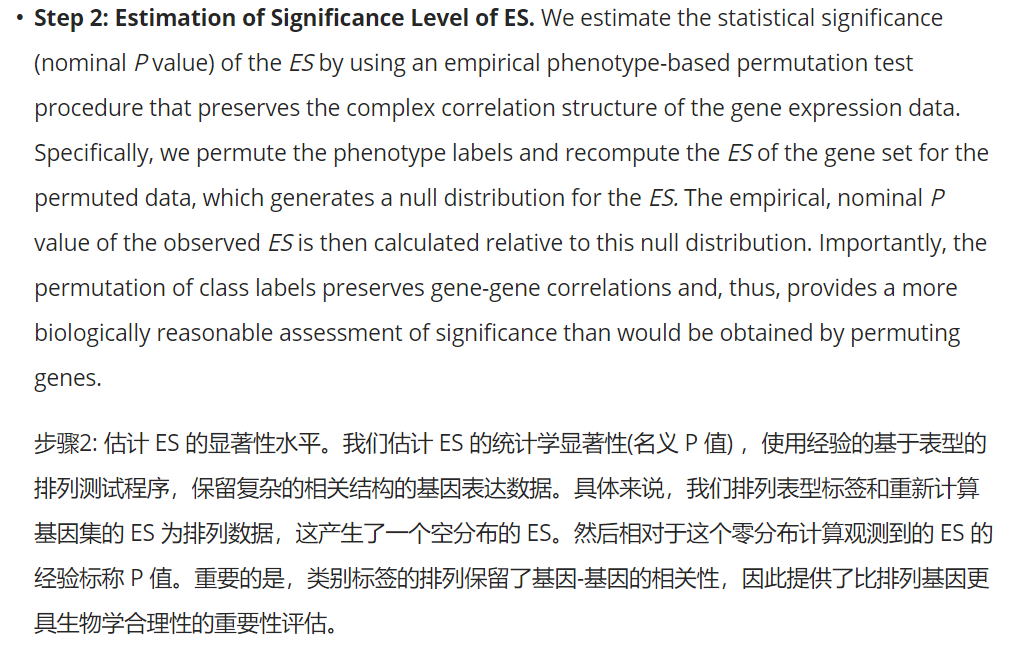 确定富集得分(ES)具有显著性。通过以表型为依据但不破坏基因间的关系进行排列检验 (permutation test),估算其出现的概率。当样本数量较小时,则采用基于基因集的排列检验 (permutation test),求取对应的p值