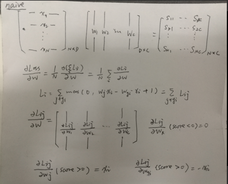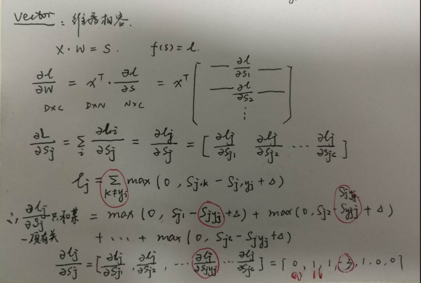 每一个大于零的项会给导数的两个列带来贡献,对于 j!=yi 的列向量,给导数的第 j 列带来 -xi 的贡献(dWj和一个样本xi包含的元素一样多,xi对应位置的分量给对应位置的dWj分量带来贡献),对于j==yi的列向量,带来xi的贡献:当