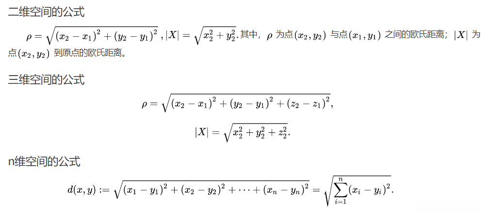 间中两个点之间的真实距离,或者向量的自然长度(即该点到原点的距离)。在二维和三维空间中