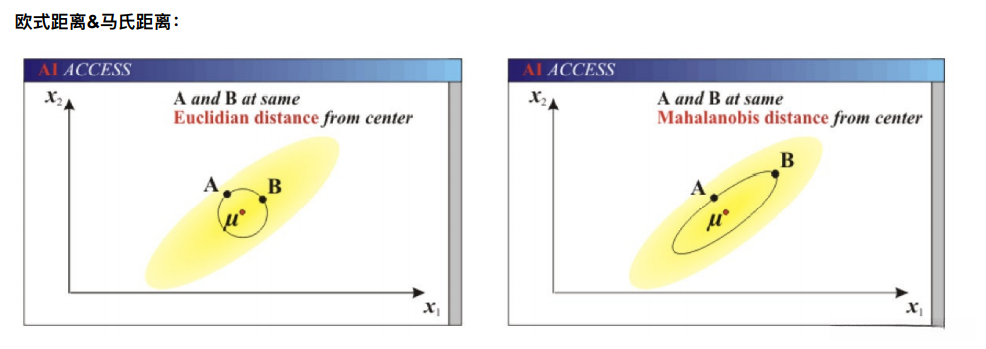 协⽅差矩阵为单位矩阵, 马氏距离就简化为欧式距离;如果协⽅差矩阵为对角矩阵,则其也可称