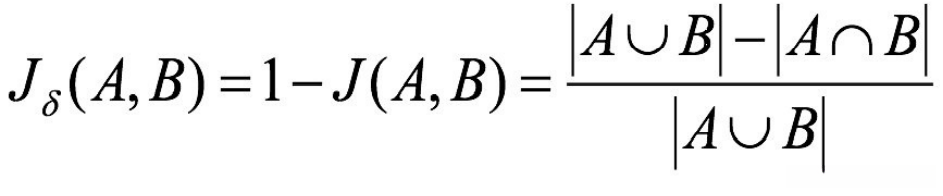 杰卡德距离(Jaccard Distance):与杰卡德相似系数相反,⽤两个集合中不同元素占所有元素