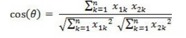 两个n维样本点a(x11,x12,…,x1n)和b(x21,x22,…,x2n)的夹⻆余弦为: