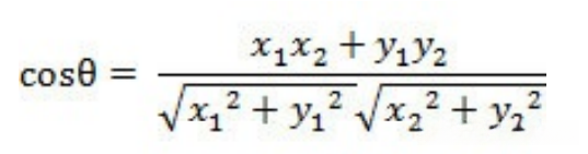 ⼆维空间中向量A(x1,y1)与向量B(x2,y2)的夹⻆余弦公式: