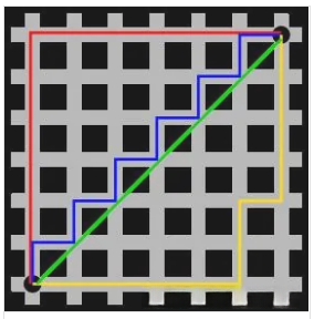 图中红线代表曼哈顿距离,绿色代表欧氏距离,也就是直线距离,而蓝色和黄色代表等价的