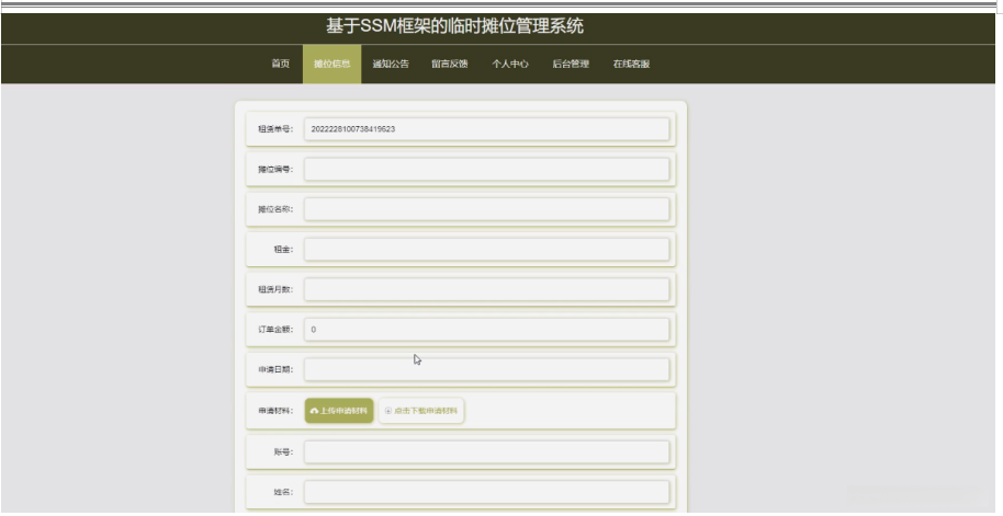 访问摊位信息页面后,请根据以下所需信息填写相关申请信息:租赁单号、摊位编号及摊位名称等基础资料;随后需提供租金金额及租赁时长设置;并填写订单金额及提交时间等必要细节;最后需准备齐全的个人身份证明文件及其他所需材料,并完成支付流程及人员登记手续。之后即可完成整个摊位租赁申请流程(如图5-4所示)。