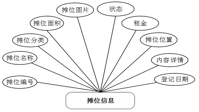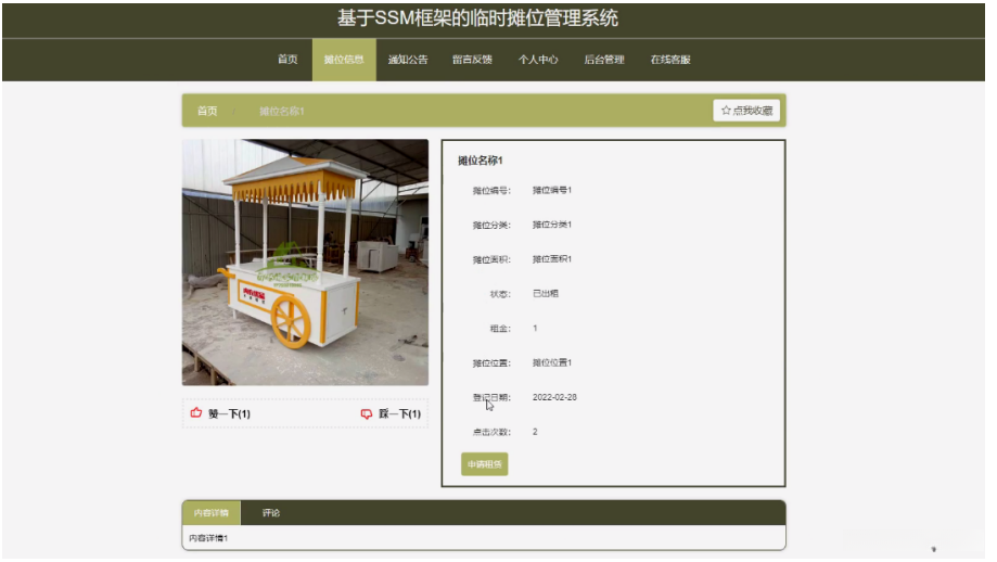 访问摊位详细信息页面, 用户将能够查看 摊位名称 详细信息, 摊位图片库, 摊位序号, 摊位分类信息, 摊位经营面积, 摊主经营状态, 租金金额, 摊主地理位置, 注册时间以及相关数据的点击统计等操作; 如图5-3所示。