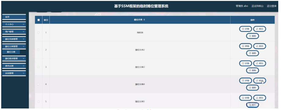 摊位分类管理模块,在该页面中支持对索引以及摊位分类项目的详细信息查看、内容调整、信息移除和新增项目等操作。