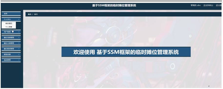 管理员登录系统后,在个人中心、用户管理、摊位信息管理、摊位分类管理、摊位租赁管理、留言反馈以及系统管理等多个方面能够执行相应的操作流程,请参见图5-10以获取详细指导