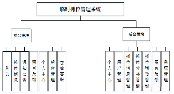 为了更好地理解本系统的整体架构,在本次研究中对本系统的功能架构进行图形化呈现,并附图展示。具体而言,在基于SSM框架下完成临时摊位管理系统的功能架构图的设计与实现工作。