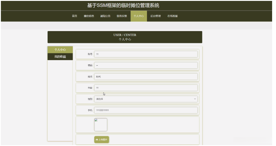 个人中心位于个人信息页面需录入账号登录账号密码以及手机号等相关基本信息还需完善出生年份性别身份认证资料并上传证件照片完成资料更新工作也可根据个人需求对我的收藏等执行相关操作如图5-5所示