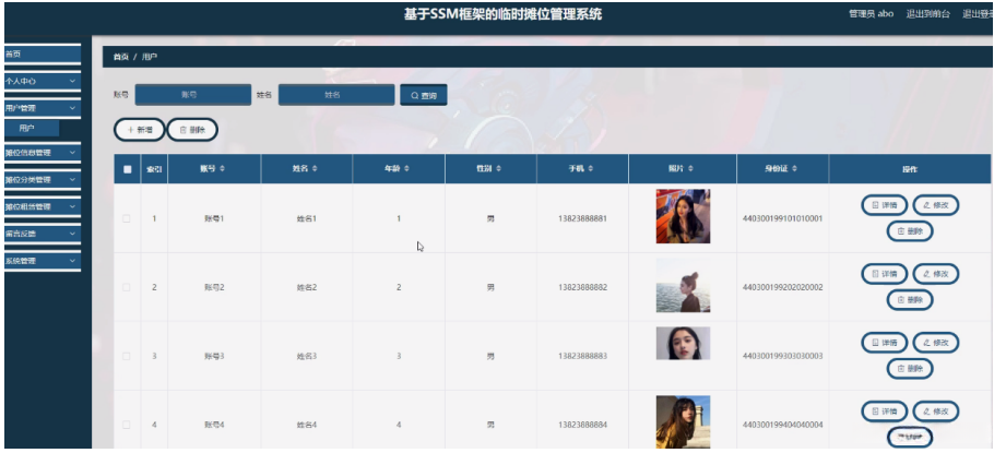 位于用户管理页面中,系统支持对以下内容进行操作:包括索引位置信息(如系统索引位置)、账号信息(如注册账号)、个人基本信息(如姓名和年龄)、个人资料信息(如性别和手机号码)、图片信息(如上传的照片)、身份验证信息(如身份证号码),以及可能的其他相关数据(如备注或其他附加信息)。这些操作包括详情查看、数据修改、记录删除以及新增内容等功能。