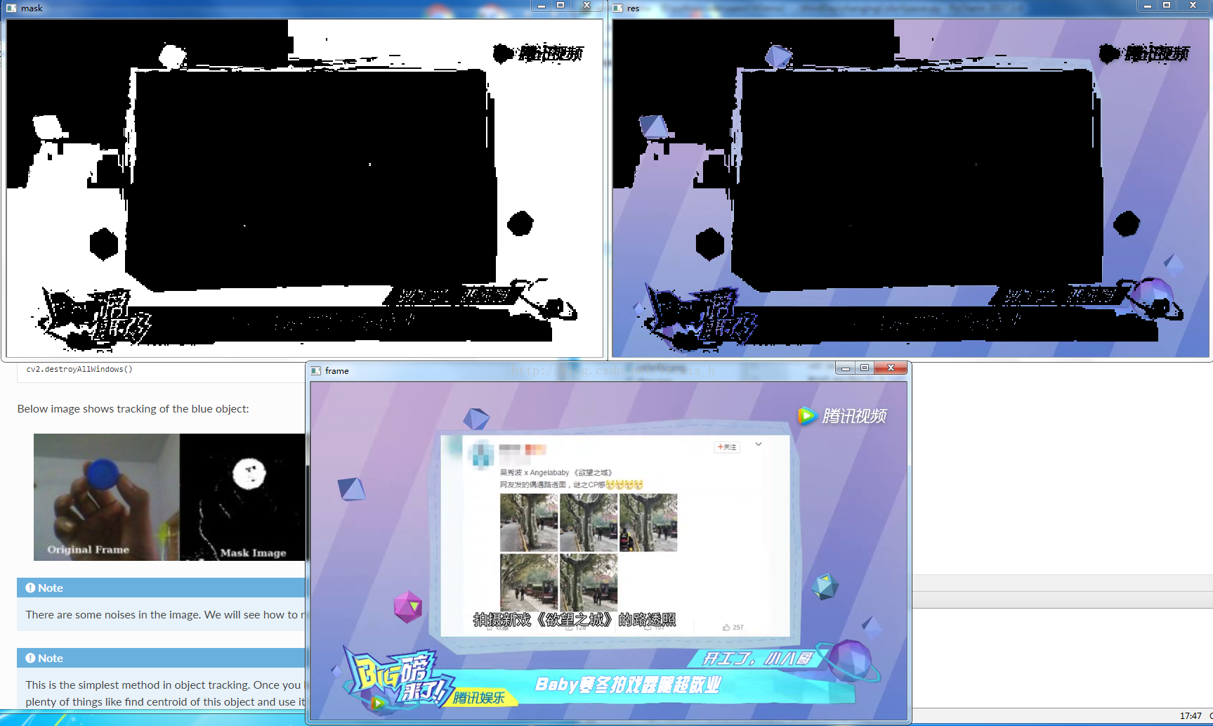 # 官网上的例子是通过追踪摄像头里面的一个蓝色小球,但是我的摄像头有问题,所以我就改成追踪video里面的东西。