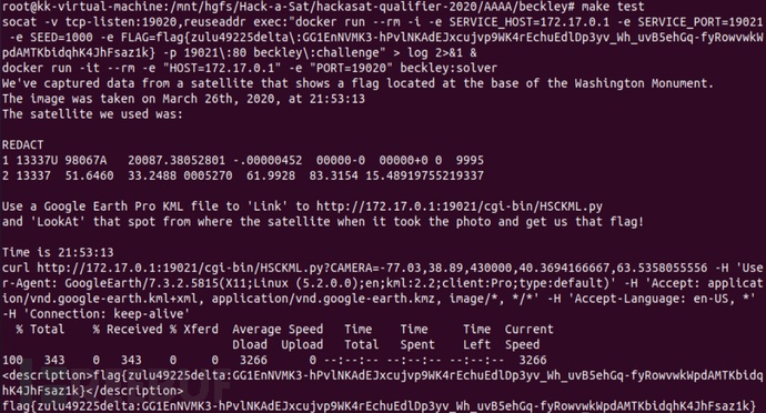 随后运行make test命令以执行测试。运行结果显示如图2-2所示,并表明该测试过程中采用curl工具访问Google Earth,并通过对其返回信息的解析提取出flag。