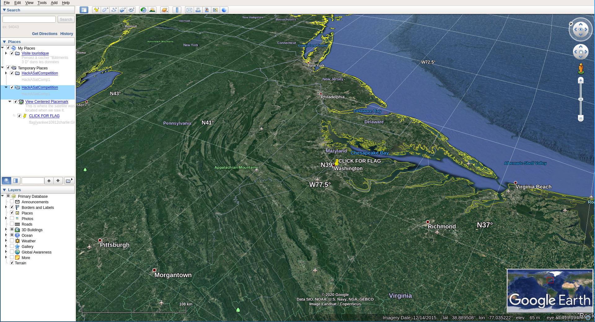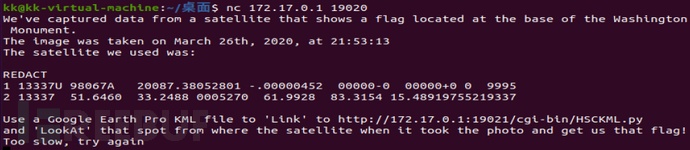 向参赛者告知当前截获了一张由卫星拍摄华盛顿纪念碑的照片,并提供了该卫星的两行轨道根数(TLE)以及照片捕捉的时间信息,请参赛者在Google Earth中模拟卫星拍照的角度和时间即可定位标记信息的位置