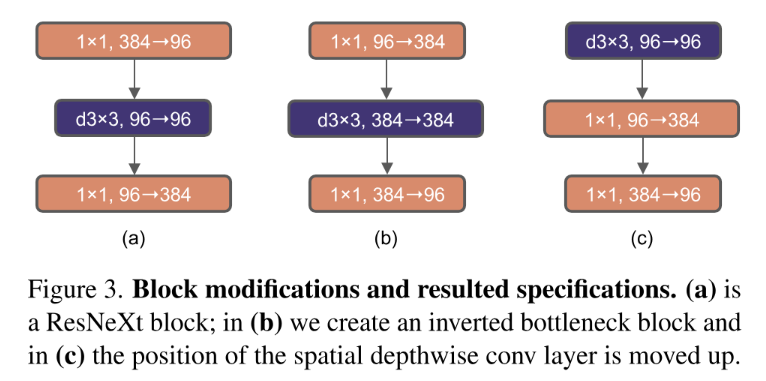 - 缩减数量优化:缩减每个模块中的激活函数与归一化层数量设计,使其结构趋近于Transformer的设计思路。