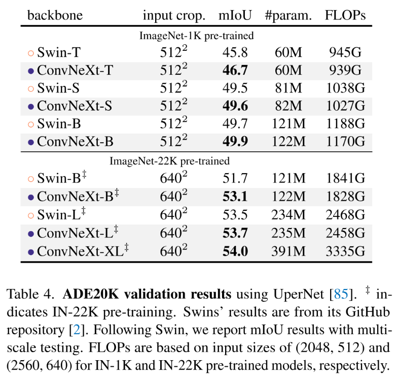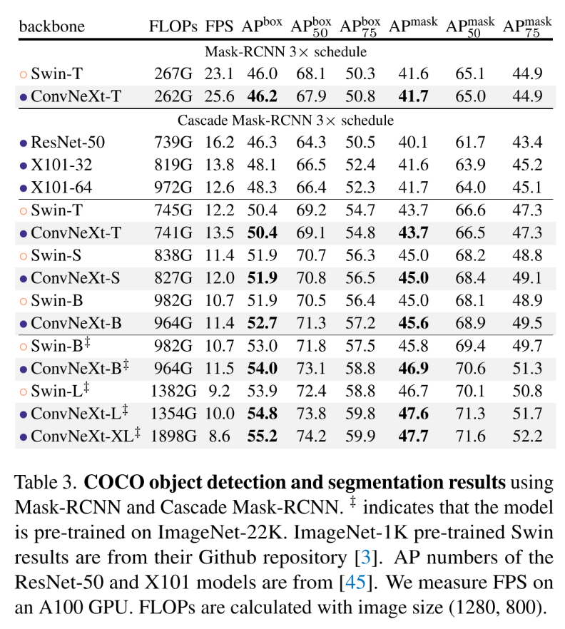 表 3 对比分析了不同架构在目标检测和实例分割任务中的性能表现。通过对现有方法的系统性研究发现,在保持相同复杂度的前提下,ConvNeXt 不逊色于Swin Transformer这一先进架构。进一步扩展到基于ImageNet-22K进行过更大规模预训练的大型预训练模型(包括B、L、XL系列),在框AP和掩模AP方面均展现了显著优势(例如实验结果表明,在某些场景下可获得+1.0 AP的提升效果)。