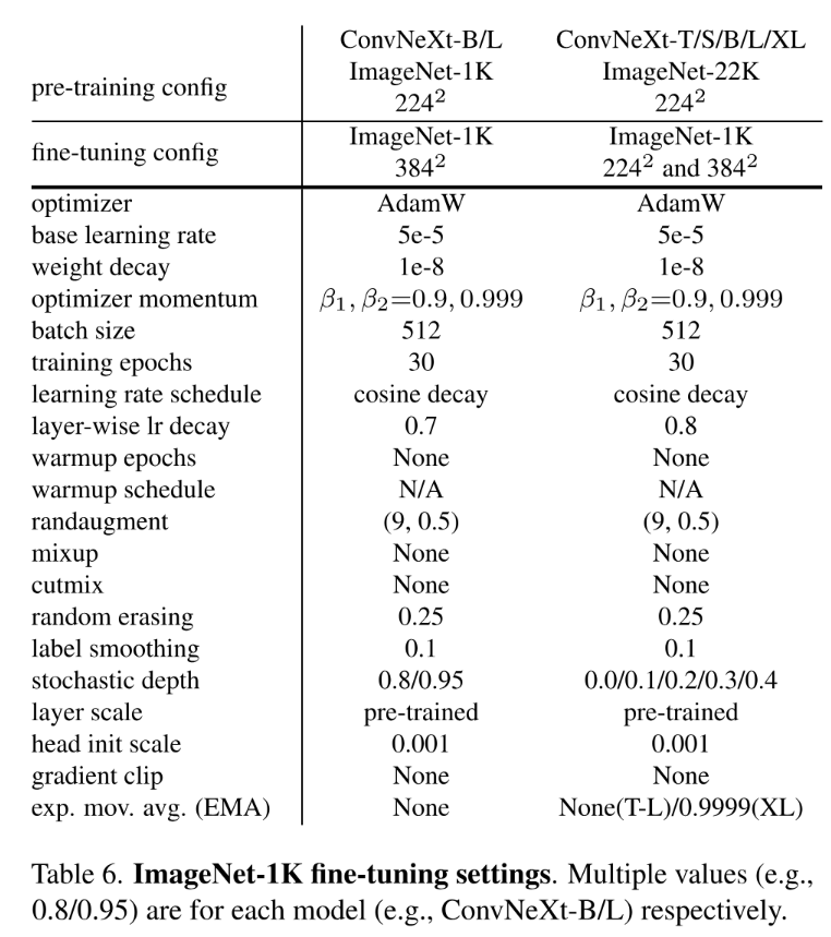 作者在表6中详细列举了在ImageNet-1K上进行微调的具体设置。基于预训练模型的最终权重进行微调时,默认情况下未采用EMA权重(即使在预训练过程中采用了EMA并且报告了EMA精度)。这是因为如果采用EMA权重进行微调,则无法观察到预期的改进(与文献[73]中的观察结果一致)。唯一例外的情况是针对ImageNet-1K上的ConvNeXt-L模型,在该案例中由于过度拟合而导致其准确率明显低于EMA精度的情况下,默认选择其最佳EMA版本作为微调起点。