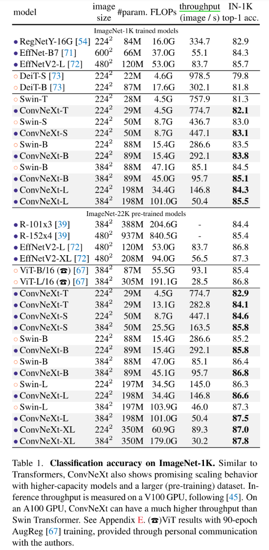 在 ImageNet-1K 数据集上,EfficientNetV2-L(被发现的一种架构结构,并配备了先进的模块组合(例如 Squeeze-and-Excitation [35])以及渐进式的训练方案)获得了最优性能。然而,在 ImageNet-22K 预训练任务中,ConvNeXt 的表现能够超越 EfficientNetV2 模型,并进一步证实了大规模预训练的重要性。