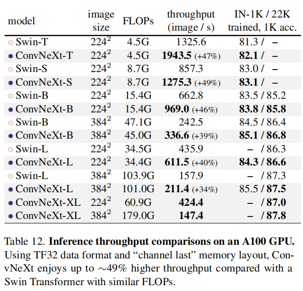 本研究的结果如表12所示。Swin Transformers和ConvNeXts均显著超越了V100 GPU在推理吞吐量上的表现。相比之下ConvNeXts的表现更为突出,在某些情况下其速度领先程度高达49%。本研究提供了一个积极的迹象表明:仅使用标准ConvNet模块且设计简洁的ConvNeXt即可实现高效性与硬件资源的最佳平衡。