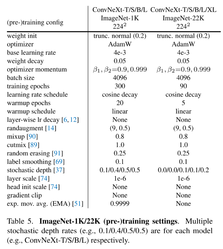研究者在表格5列出了ConvNeXts模型在ImageNet-1K上的训练结果以及ImageNet-22K预训练配置。除了随机深度率外的所有ConvNeXt变体采用了统一配置。