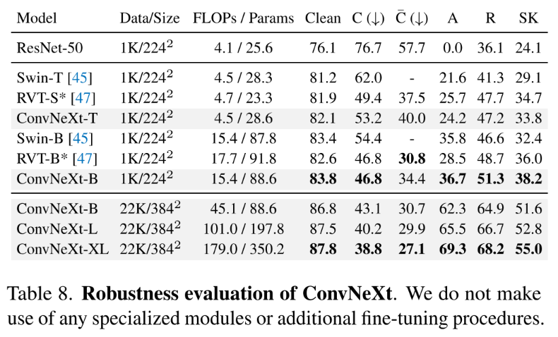 表8汇总了ConvNeXt模型在多个稳健性基准上的评估结果。我们直接使用ImageNet-A[33]、ImageNet-R[30]、ImageNet-Sketch[78]以及ImageNet-C/\bar{C}[31,48]等基准数据集对我们的ImageInt-1K训练与微调分类模型进行了测试。我们测量了Imaginett-C的平均破坏误差(mCE)、Imaginett-\bar{C}的破坏误差以及所有其他数据集上的最高准确率。