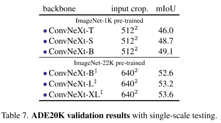 我们采用了 UperNet [85] 对 ADE20K 语义分割任务 进行评估,并对 ConvNeXt 主干进行了具体测试。在经过 16 万次迭代后完成训练过程,并采用每批处理 16 个样本的方式进行数据输入。此外,在实验细节设置上主要参考了文献 [6] 的相关方法和技术方案。